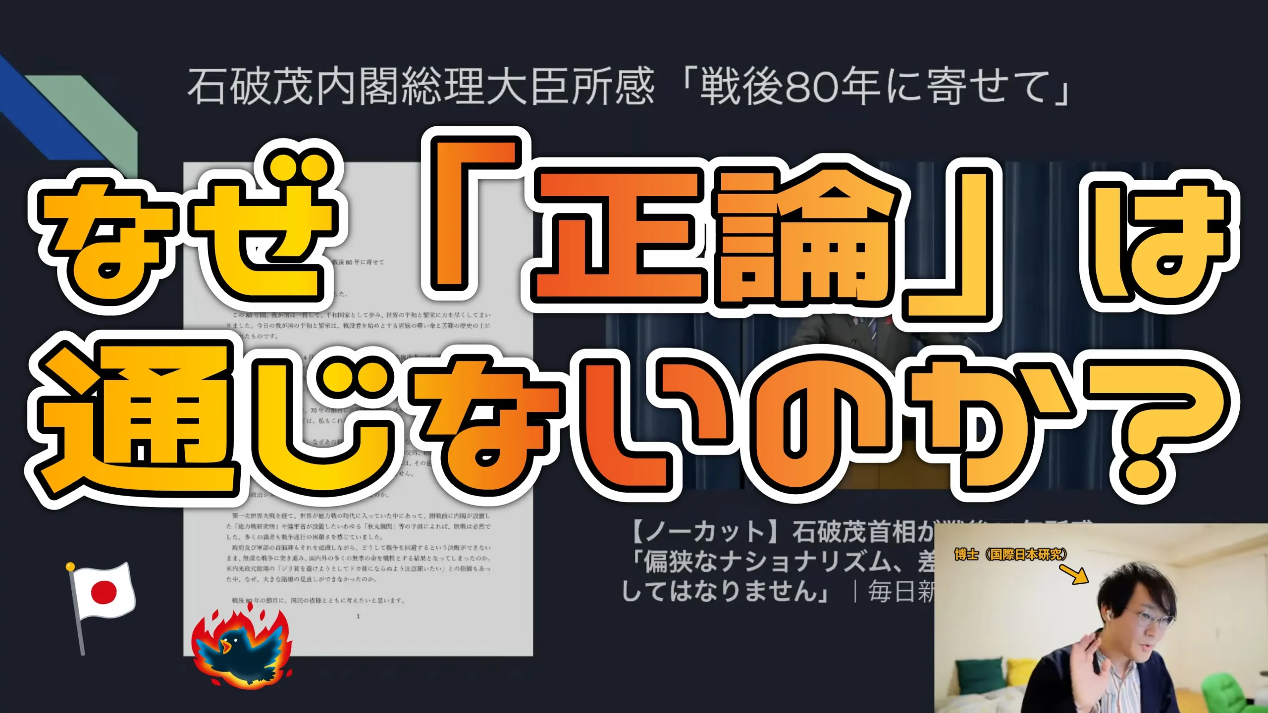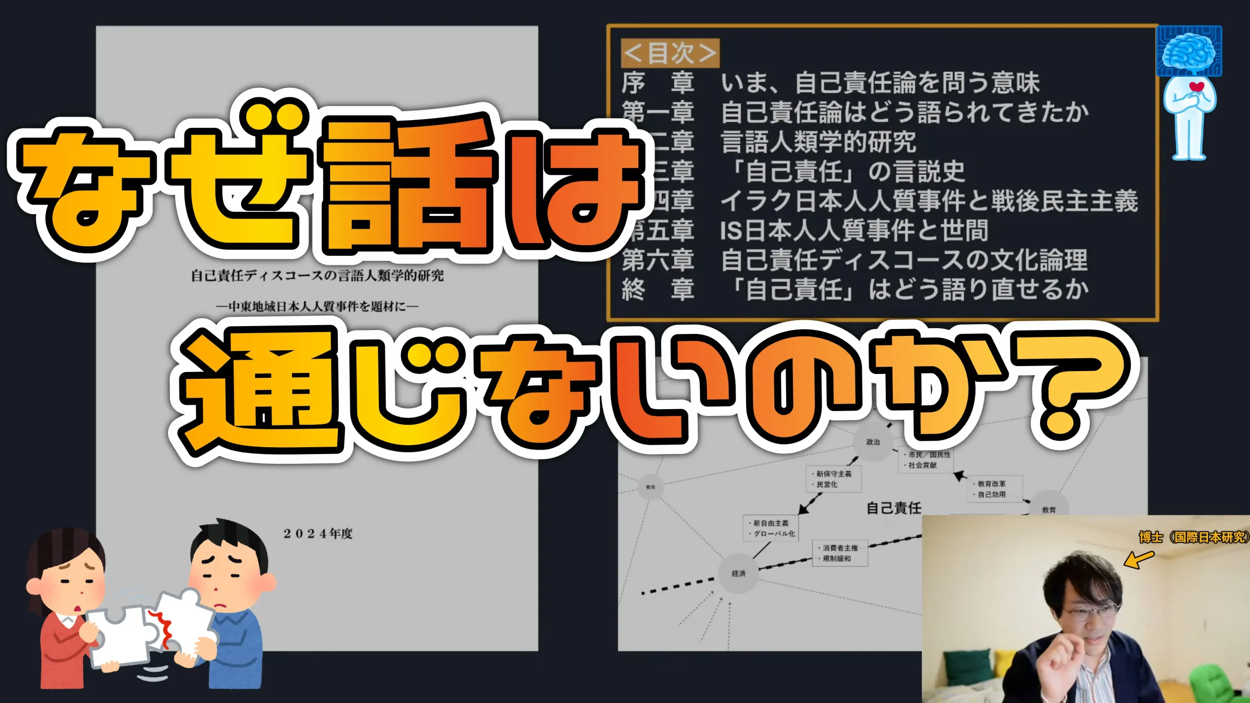 青山俊之が博士論文で取り組んできた「自己責任論」の研究をベースに、現代日本の「空気」や「違和感」を言語人類学的に読み解く試みを初LIVE配信でご紹介! 石破茂「戦後80年所感」が遅れて出された意味、そしてなぜ「自己責任」と「迷惑」はセットで語られるのかなどなど。議論のための議論ではなく、実感を伴った「問い」を共有したい。そんな思いで、今後もこうした発信を続けていきます。チャンネル登録もよろしく!