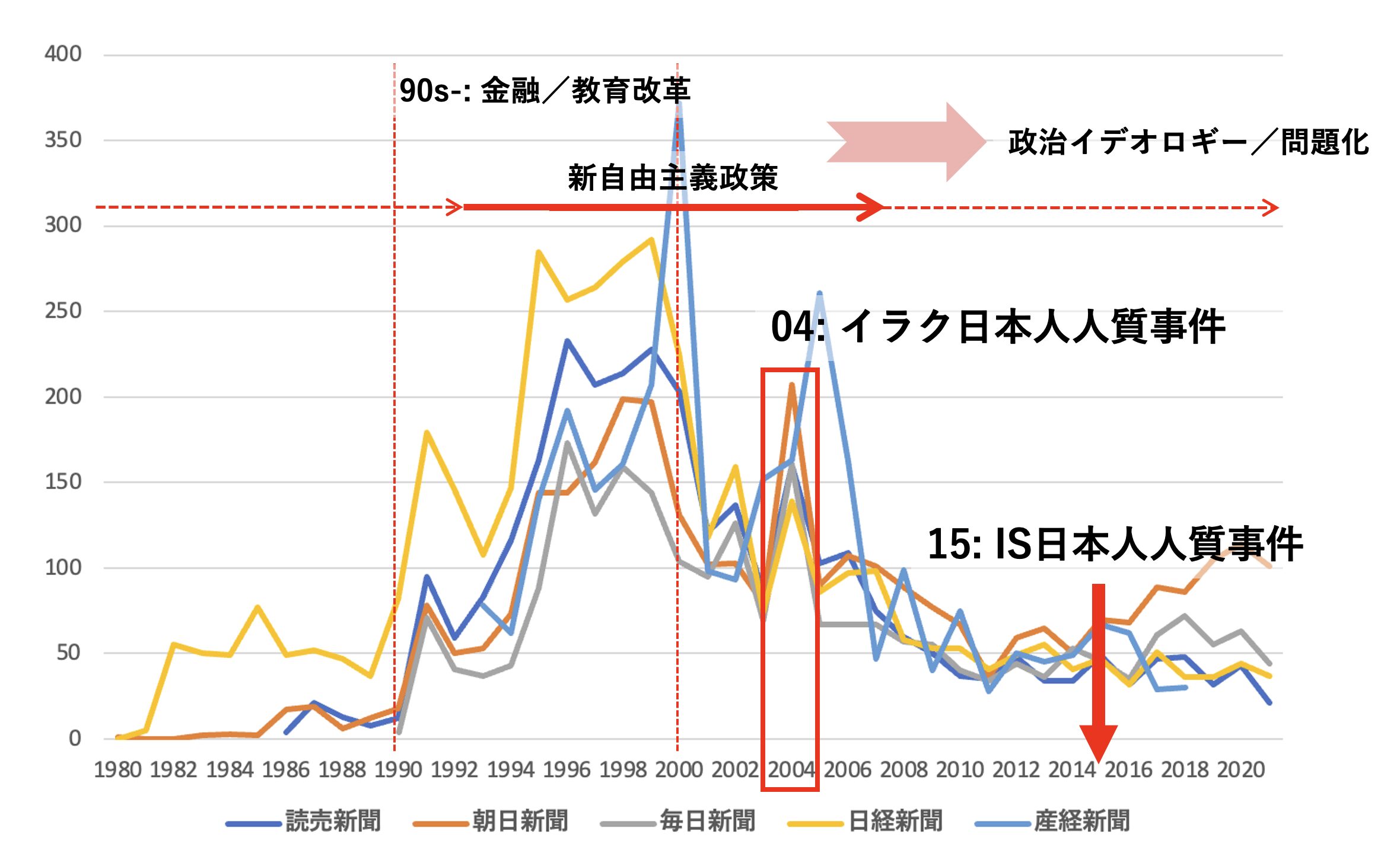 「自己責任」を考えることは日本社会の「失われた30年」を考えることにつながります。経済・教育・政治にて「自己責任」はなにを意味していたのか。その軌跡を全国新聞五紙を中心に追いました。