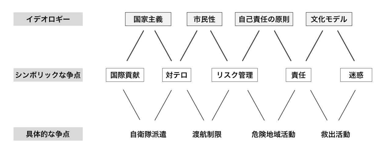 両紙のイデオロギー的な差異は明確にありつつも、一方で両紙とも人質3名とその家族に対し、世間を騒がせたことに対し「迷惑」をかけているという論調が自己責任論の理由づけに用いられていた点が共通していました。国家主義的な保守派も、市民性を重視するリベラル派も、この人質らが社会に印象づけた「迷惑をかけた」ことに関しては否定しがたい実態・規範として認識されたものだったことを明らかにしました。