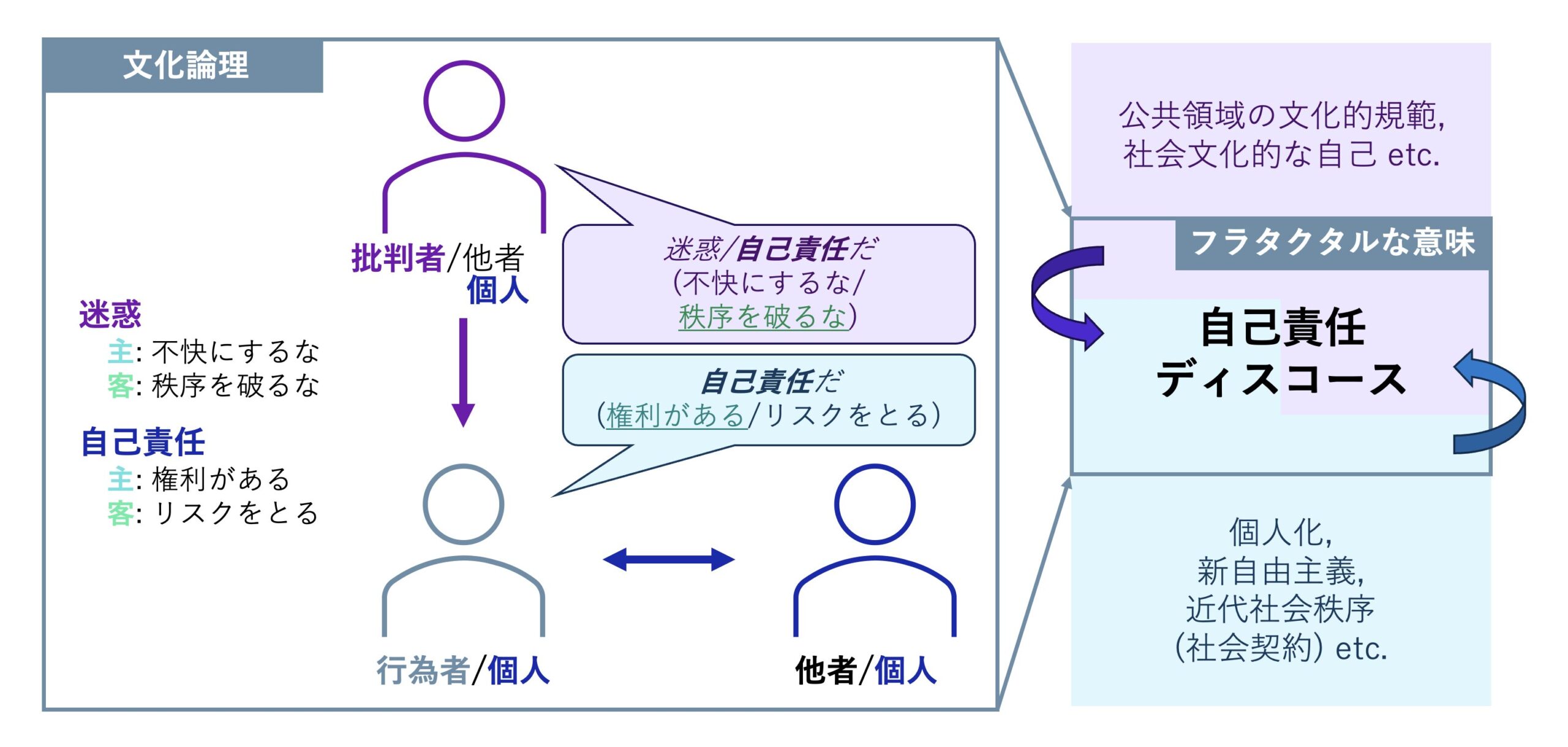 研究で着目したのは、自己責任論に関連しつつもこれまでの議論では積極的に分析されてこなかった日本の文化規範として、自己観と責任観の相互的な関係の分析と考察を掘り下げました。特に、欧米的な自己観を「自己が責任をとる」としたら、日本的な自己観は「自己における責任がある」という場・基体を経由している点に焦点を当てました。