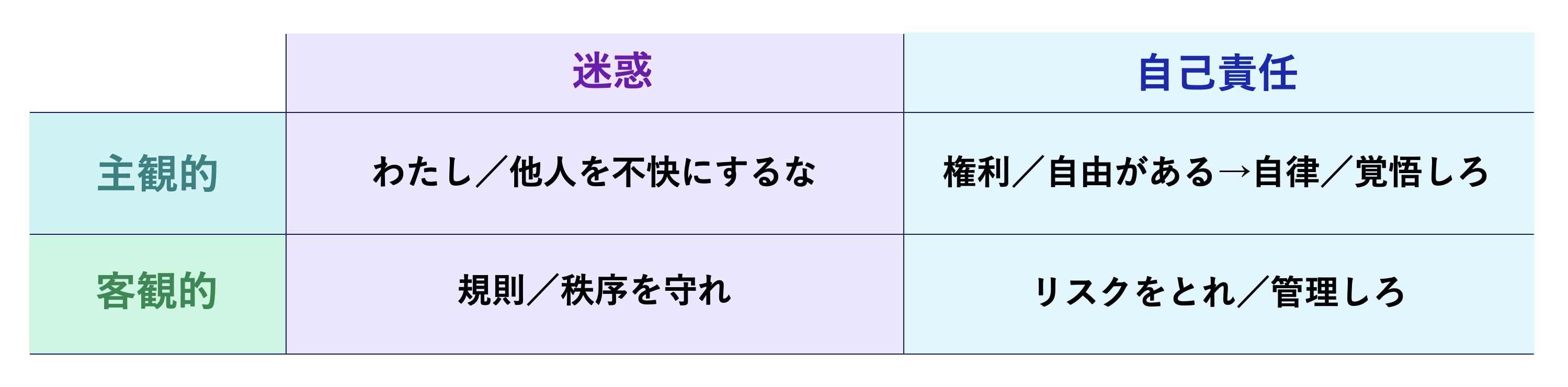個人の自主自律と解釈される「自己責任」は他者から自律を要請されることばでもあります。そこに潜む価値観の相違とはなにか。日本の文化規範について考えました。