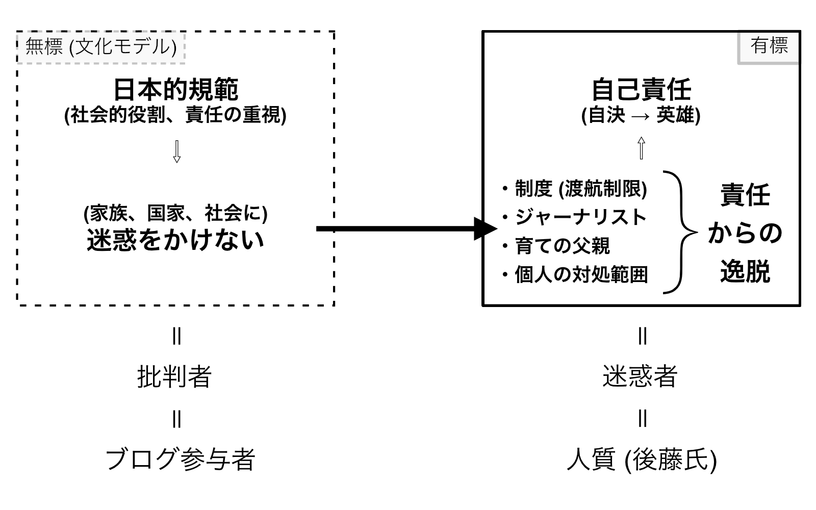 一見すると、自由で自律的な個人を意味するのが「自己責任」とも解釈できます。ですが、ぼくの論文では人質事件では他者が自律「させる」ものとして自己責任論が論じられたことを発見した。そこには日本の文化規範が関係している。これが論文の結論です。